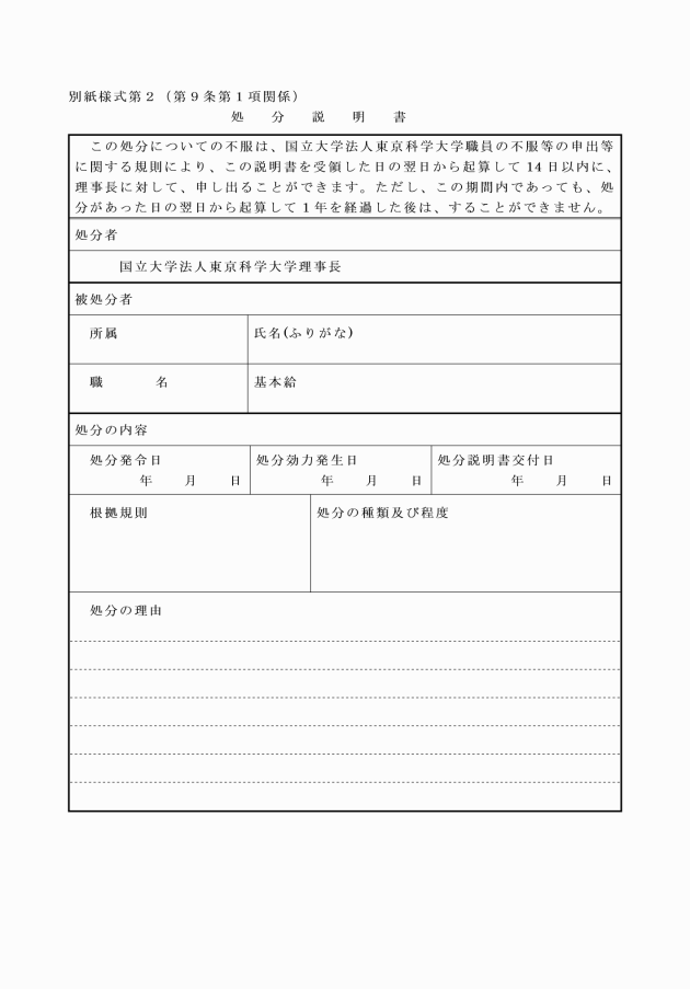 第9条 無期雇用職員就業規則第12条第3項に規定する処分の事由を記載した説明書(以下「処分説明書」という。)の様式は、別紙様式第2に掲げる様式とする。